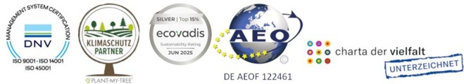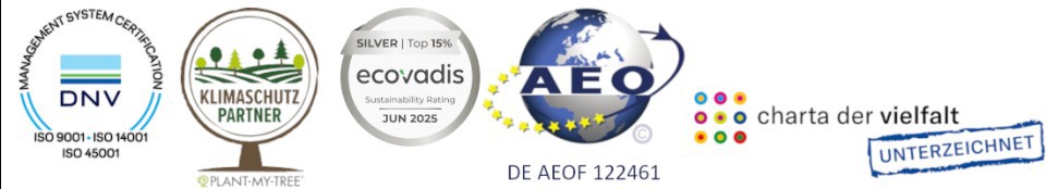 - Zertifizierungen & Lizenzen: ISO 9001, ISO 14001, ISO 45001, AEO, IATA, Gefahrgut, EcoVadis, Charta der Vielfalt, Verhaltenskodex für Geschäftspatner